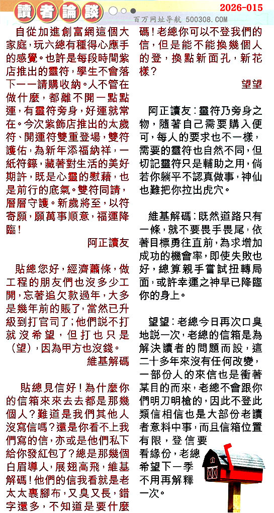 015期:彩民推荐〖貼信讀者論壇〗〖曾道人信箱〗